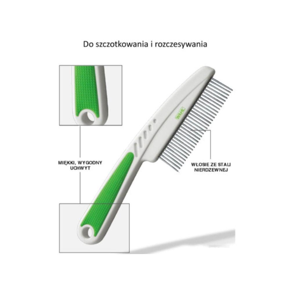 Brend: WHAL Model: Detangling Comb Tip proizvoda: Češalj za negu dlake ljubimaca Materijal sečiva: Inox (nerđajući čelik) Ručka: Soft-grip (ergonomska, protivklizna) Pogodno za: Srednju i dugu dlaku Dimenzije: 20 × 1,4 × 5,3 cm Težina: 52 g Upotreba: Uklanjanje poddlake, raspetljavanje zamršene dlake, svakodnevna nega