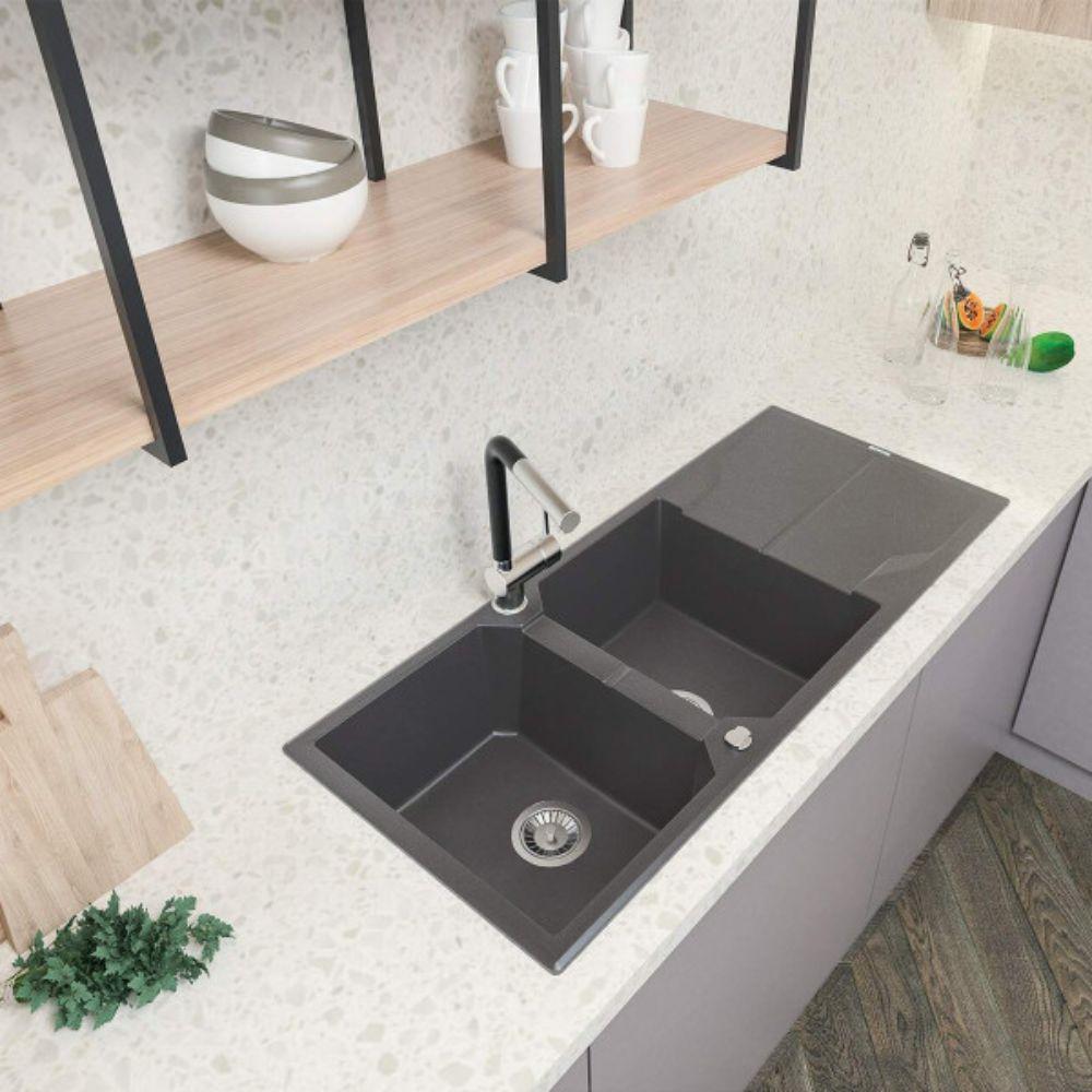 Model: Andante 116/MAN/O/2 ZQN T213 Vrsta proizvoda: Kuhinjska sudopera Boja: Antracit Materijal: Granit Broj korita: 2 Dubina korita: 21 cm Oceđivač: Da Tip ugradnje: Standardna Odvod: 3,5 inča Širina korpusa za ugradnju: 80 cm Daljinski podizač: Da Dimenzije sudopere (ŠxDxV): 1160 x 500 x 224 mm