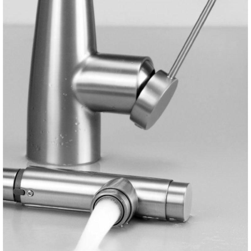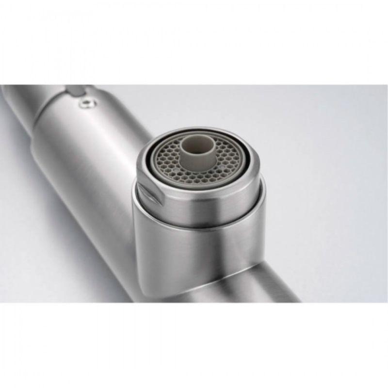 Deante Eridan slavina BRE F75M u brušenom inox finišu donosi kombinaciju funkcionalnosti i savremenog dizajna za vašu kuhinju. Opremljena je tuš glavom na izvlačenje sa dva tipa mlaza, što omogućava lakše ispiranje posuđa i sudopere. Slavina poseduje priključak za filtriranu vodu, što je idealno za svakodnevnu upotrebu. Zahvaljujući Z klasi protoka (4-9 l/min), omogućava smanjenu potrošnju vode bez gubitka performansi. Montažna čaura olakšava instalaciju, a slavina se može postaviti čak i blizu zida. Inovativni premaz olakšava održavanje, dok mlazni aerator doprinosi boljoj kontroli protoka.