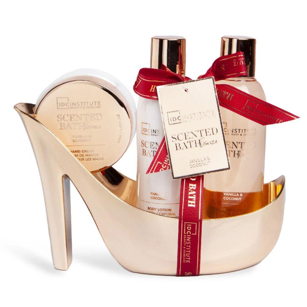 IDC Institute Secret Bath – Bronze Limited Edition poklon set za telo donosi luksuz i eleganciju u svakodnevnu rutinu nege. Set uključuje gel za tuširanje koji osvežava i čisti kožu, losion za telo koji pruža dugotrajnu hidrataciju i mekoću, kao i kremu koja hrani i regeneriše kožu. Obogaćen zavodljivim mirisom vanile i kokosa, ovaj set ostavlja kožu nahranjenom, nežnom i prefinjeno mirisnom. Pakovan u atraktivno ukrasno postolje u obliku cipele na štiklu, idealan je kao poklon za posebne prilike ili luksuzni dodatak sopstvenoj kolekciji.