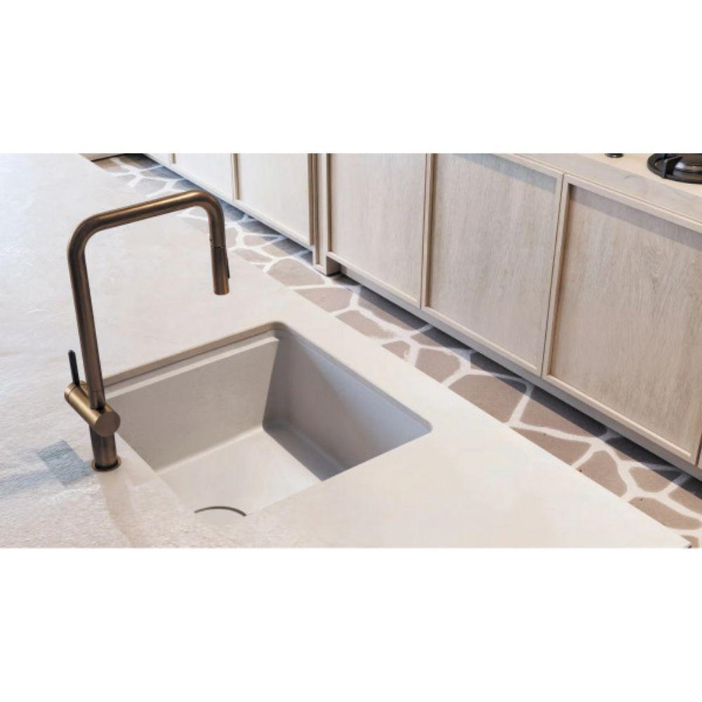 Brend: Deante Model: MOMI BKM C73N Boja: Brušena bronza Visina: 408 mm Raspon: 260 mm Završna obrada: Inovativan premaz, otporan i lak za održavanje Izliv: Na izvlačenje, sa 2 funkcije Dužina creva za izvlačenje: 1500 mm Tip mešača: Jednoručni, keramički Način ugradnje: Stojeći Priključna creva: 2 x 45 cm, uključena Montaža: Montažna čaura za lakšu instalaciju Ventili: Nepovratni ventili protiv vraćanja mešane vode Klasa protoka: Z (4–9 l/min) – ušteda vode