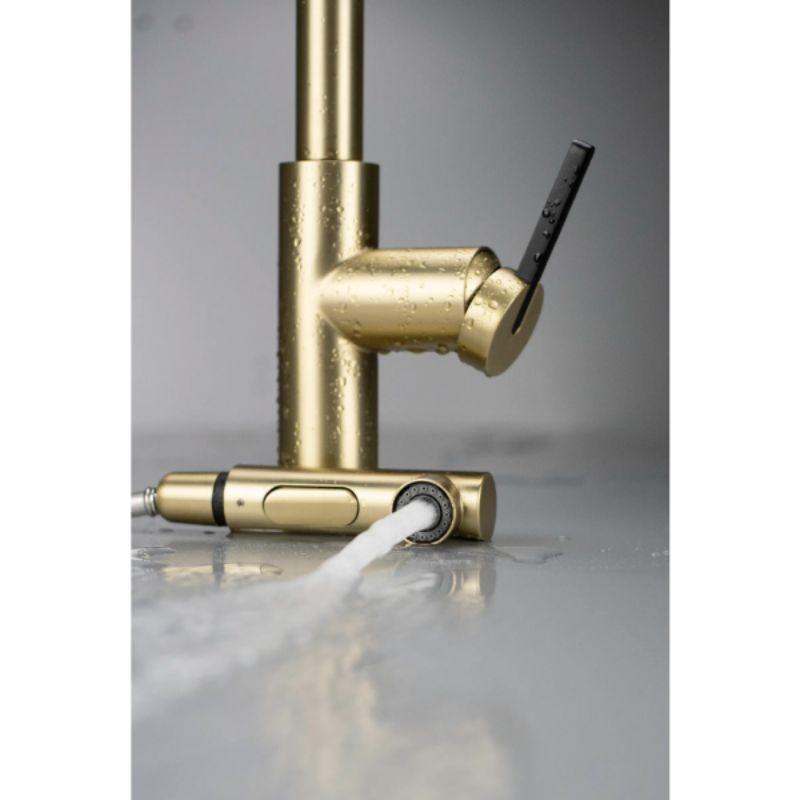 Deante MOMI BKM R73M kuhinjska slavina u luksuznoj brušenoj zlatnoj boji donosi eleganciju i funkcionalnost u svaki enterijer. Tuš glava sa dve funkcije omogućava fleksibilnost pri pranju, dok izliv na izvlačenje olakšava svakodnevne kuhinjske zadatke.